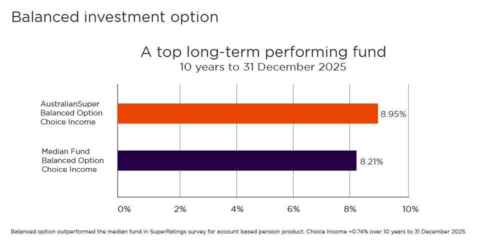 AustralianSuper’s history of strong, long-term performance has seen our Choice Income Balanced option deliver an average annual return of 8.95% over 10 years to 31 December 20256.
